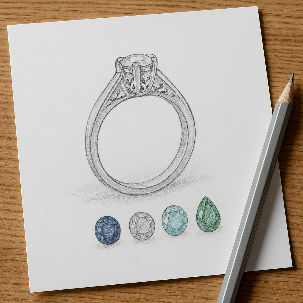 In this phase we imagine the setting together and choose the stone. The project takes shape on paper, freehand, as it was done once.